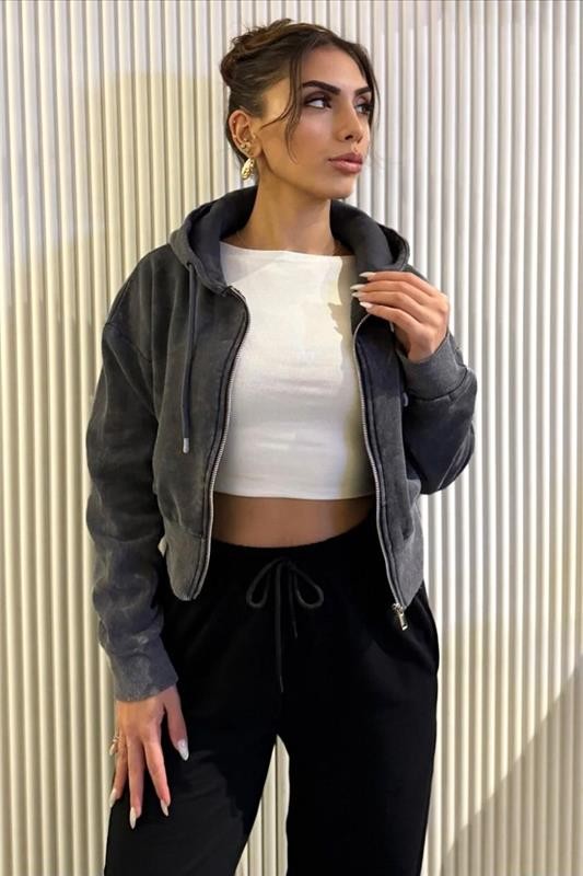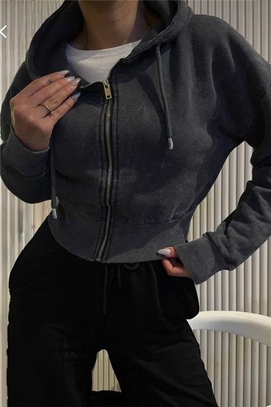 - Krótka bluza z praktycznym kapturem wiązanym i gumką u dołu.