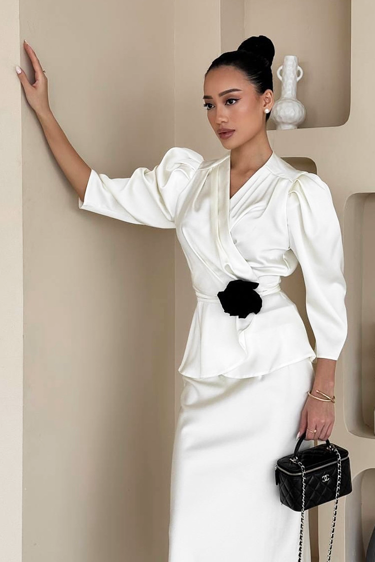 - Koszula ma elegancki krój, bufiaste rękawy i atrakcyjny wzór czarnej róży, a spódnica ma dopasowany krój i długość midi.