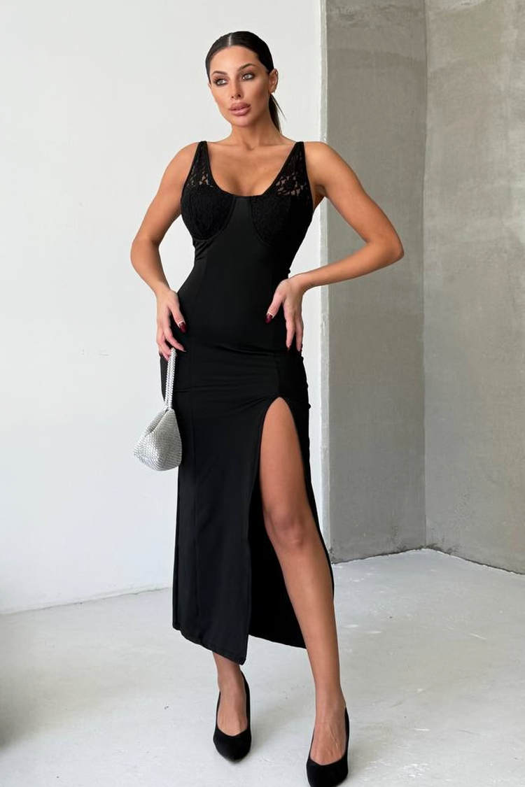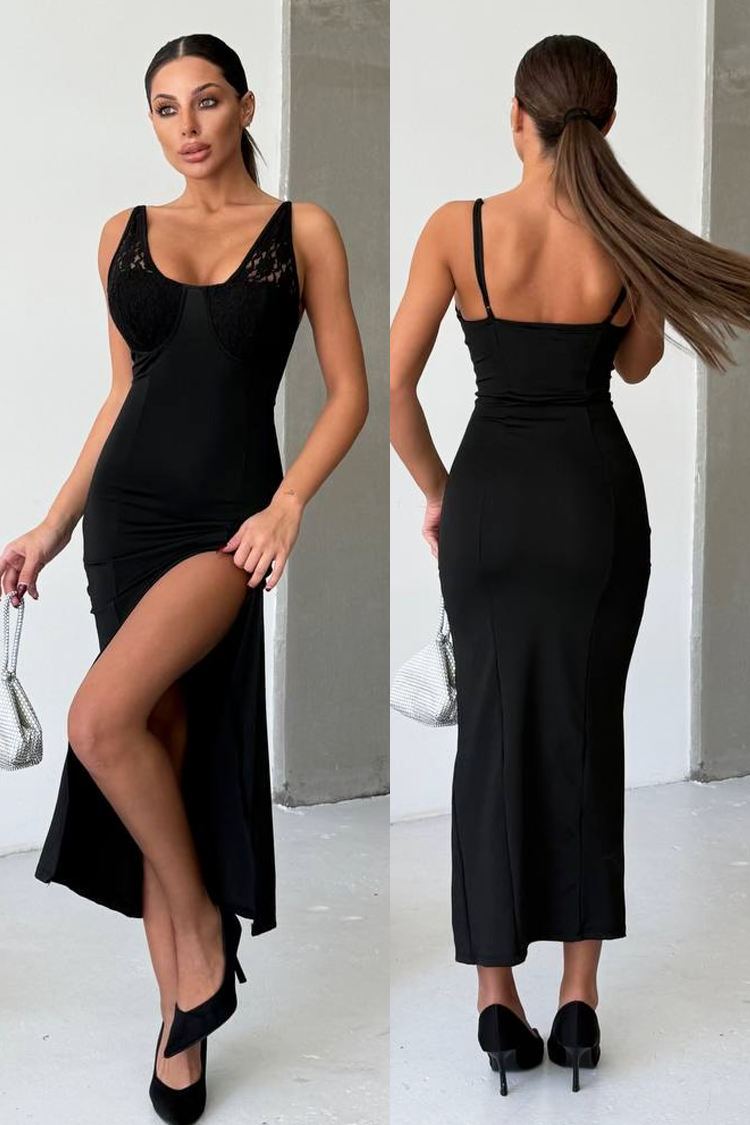 - Model ma głęboki dekolt i seksowne rozcięcie.