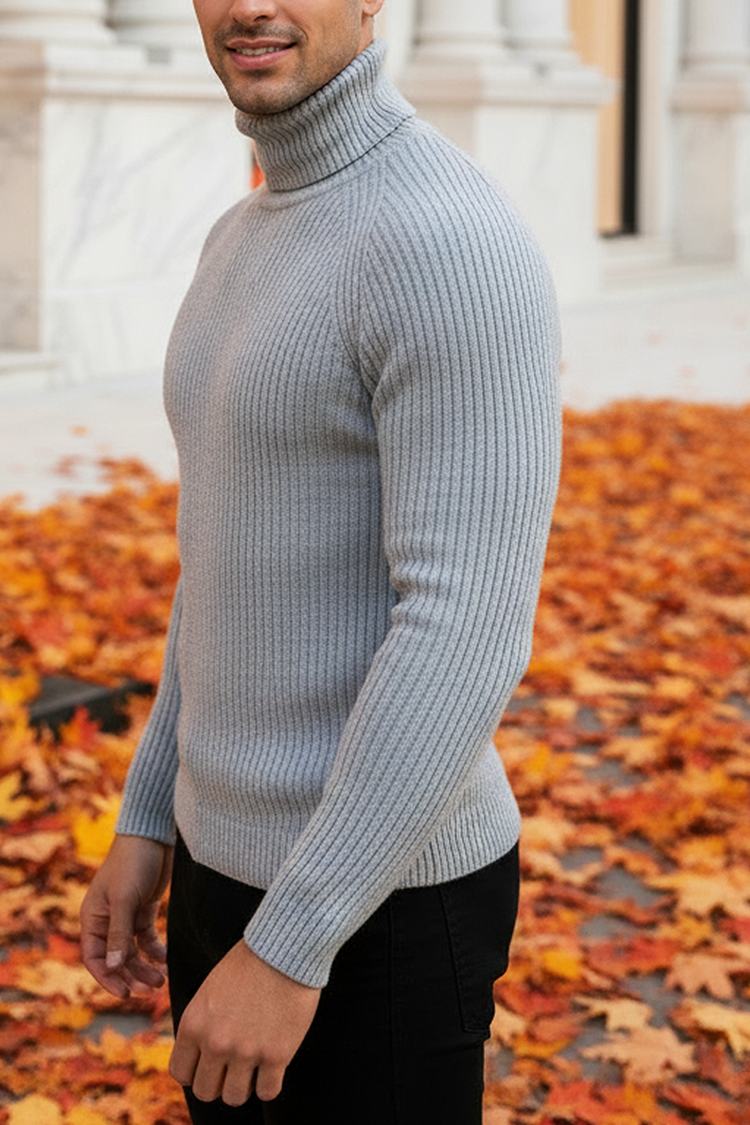 - Ciepły męski golf i prostym wzorem w kolorze szarym, pasujący do różnych stylizacji.
