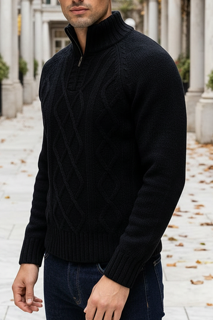 - Ciepły męski sweter z zamkiem błyskawicznym i wytłoczonymi motywami w kolorze czarnym, pasujący do różnych stylizacji.