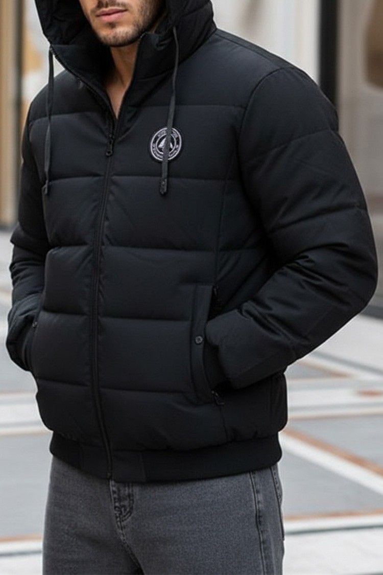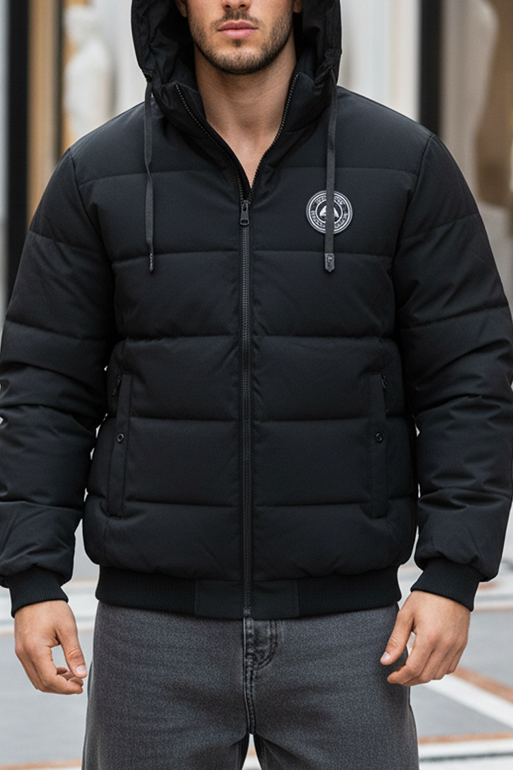 - Praktyczna i ciepła męska kurtka z emblematem, kieszeniami i kapturem ze ściągaczami, łącząca wygodę z nowoczesnym, miejskim designem.