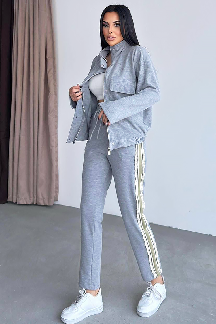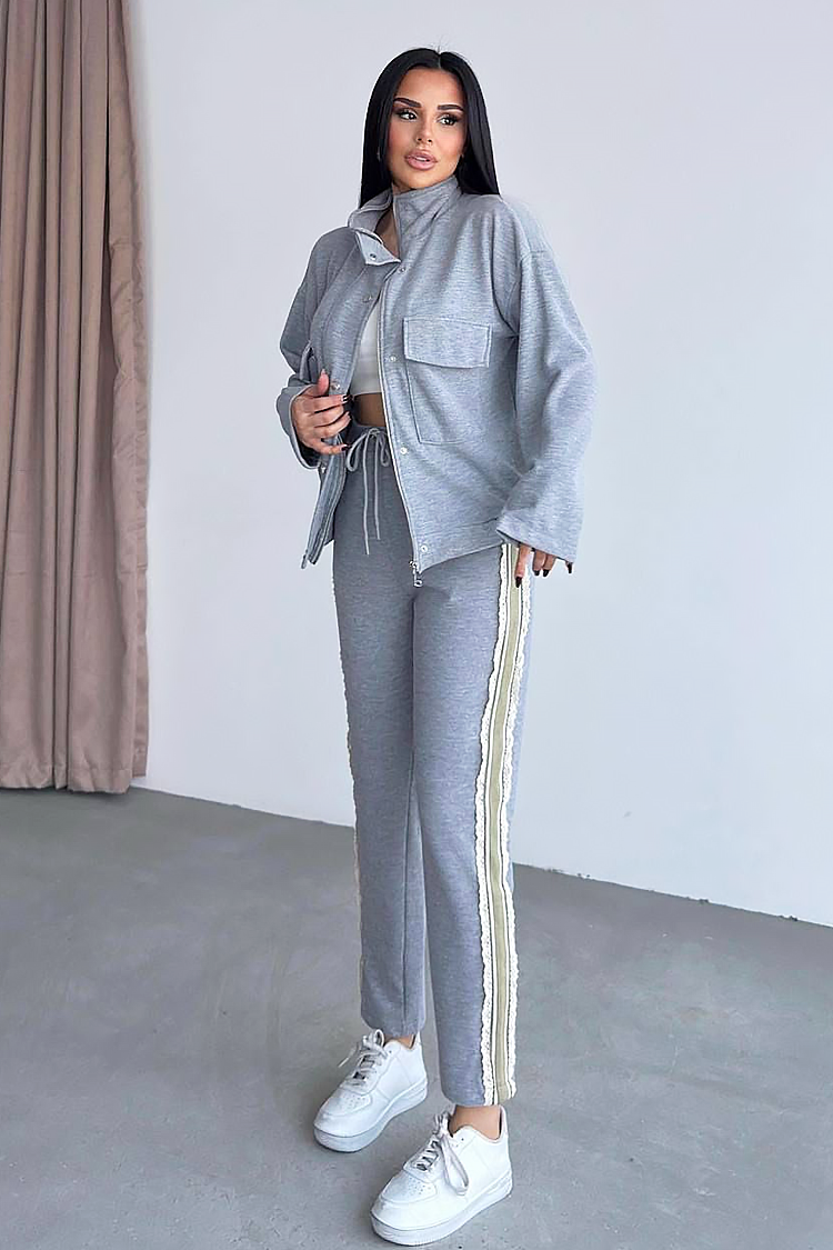 - Spodnie mają wysoki stan i gumkę w pasie z wiązaniem, a bluza ma modny krój i kołnierzyk.