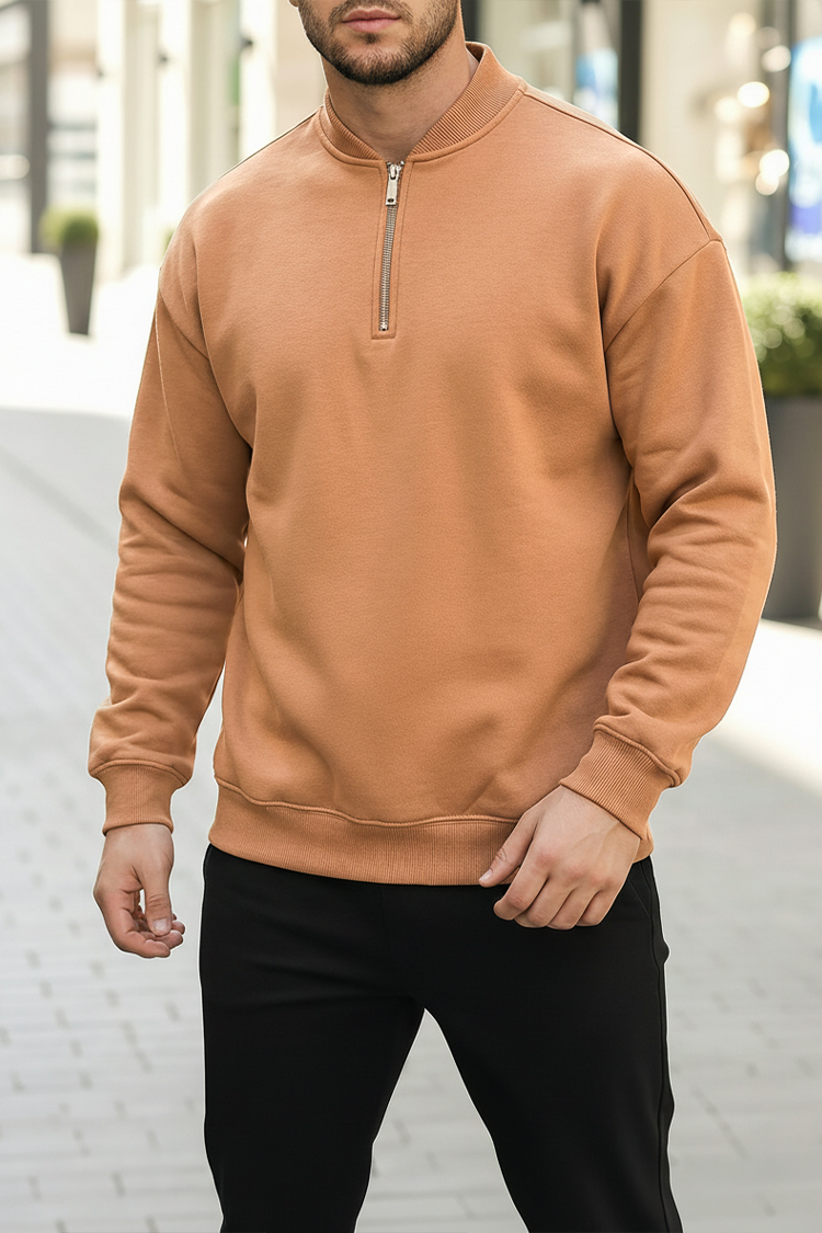 - Stwórz nowoczesną stylizację z tą praktyczną bluzką z dekoltem zapinanym na zamek i długimi rękawami w kolorze brzoskwiniowym.