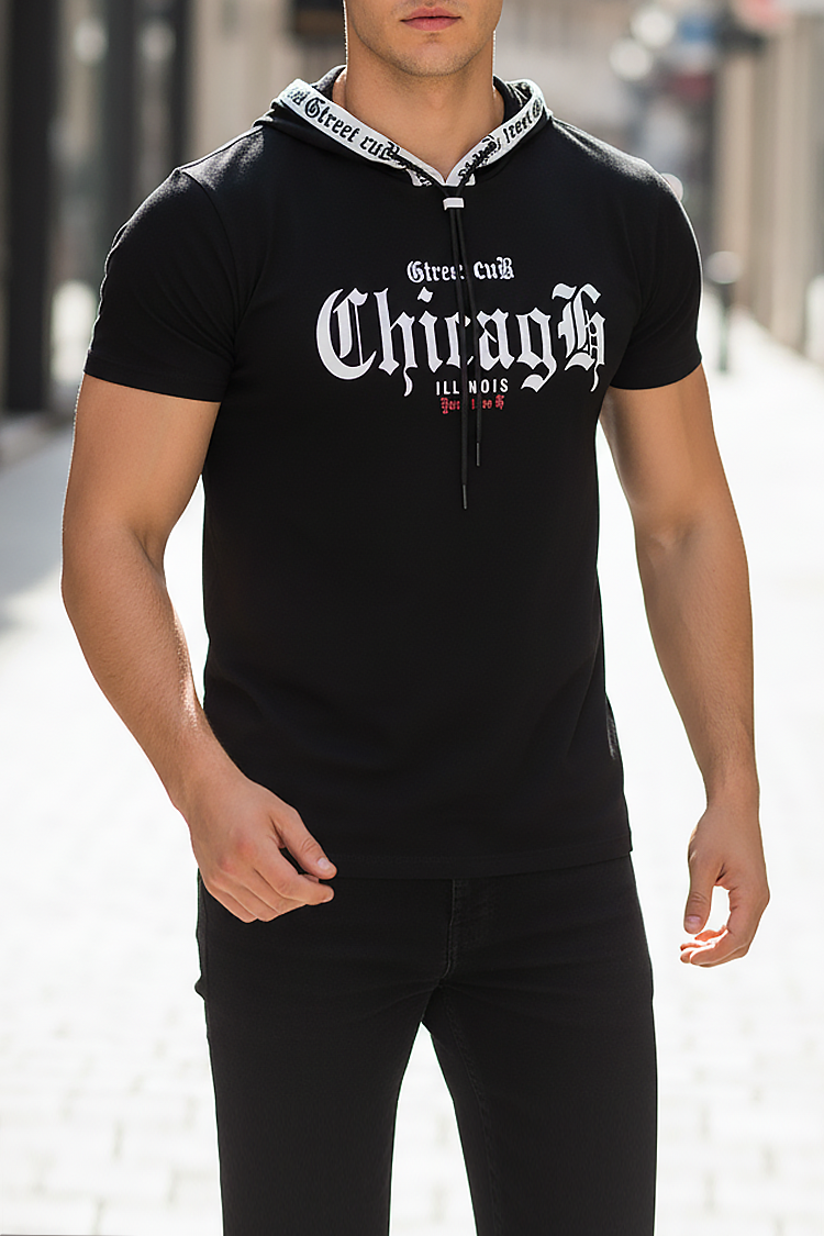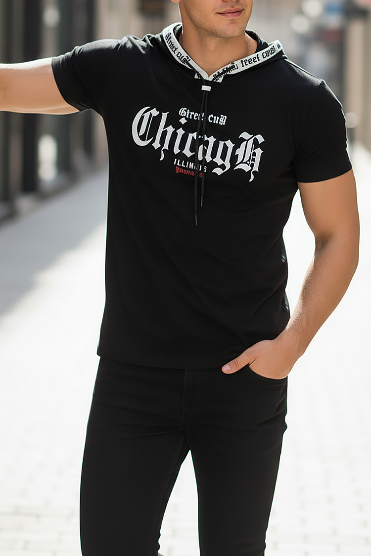 - Nowoczesny męski T-shirt o wygodnym kroju, z kapturem ze ściągaczem i nadrukiem, odpowiedni na co dzień, na spacer lub jako dodatek do sportowego looku.