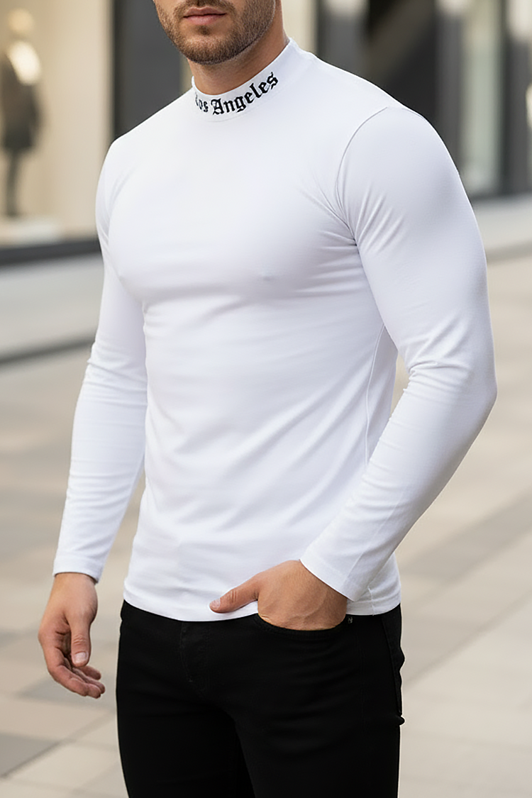 - Aktualny model męskiej koszuli o kroju slim-fit z kołnierzykiem z nadrukiem w kolorze białym.