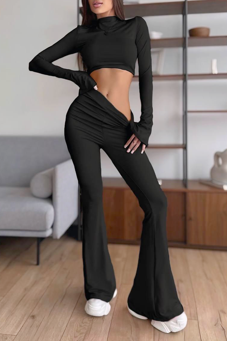 - Góra ma skróconą długość, a spodnie mają wysoki stan i dopasowany krój.