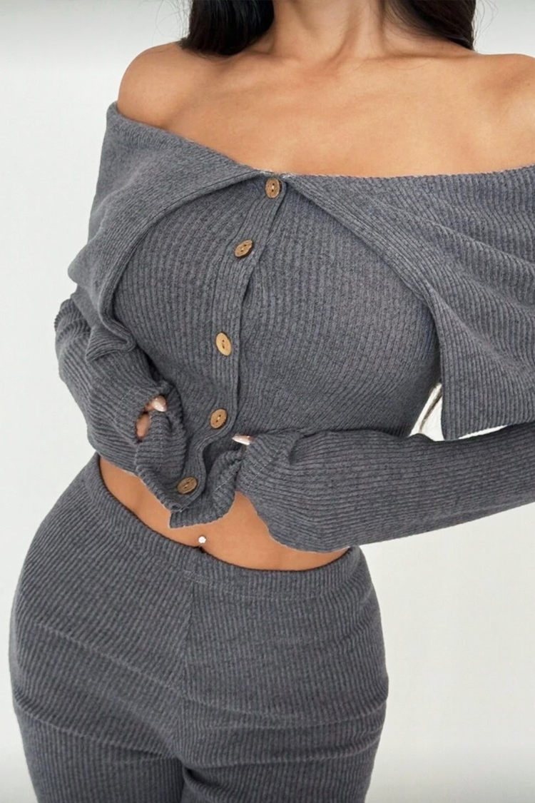 - Bluzka ma obniżone ramiona, guziki i skrócony krój, a spodnie mają wysoki stan i dopasowany krój.
