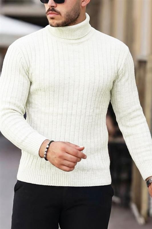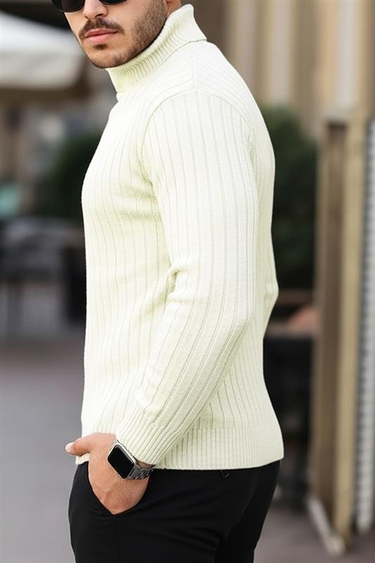 - Wygodny męski golf i pionowym prążkowanym wzorem w kolorze ecru, pasujący do różnych stylizacji.