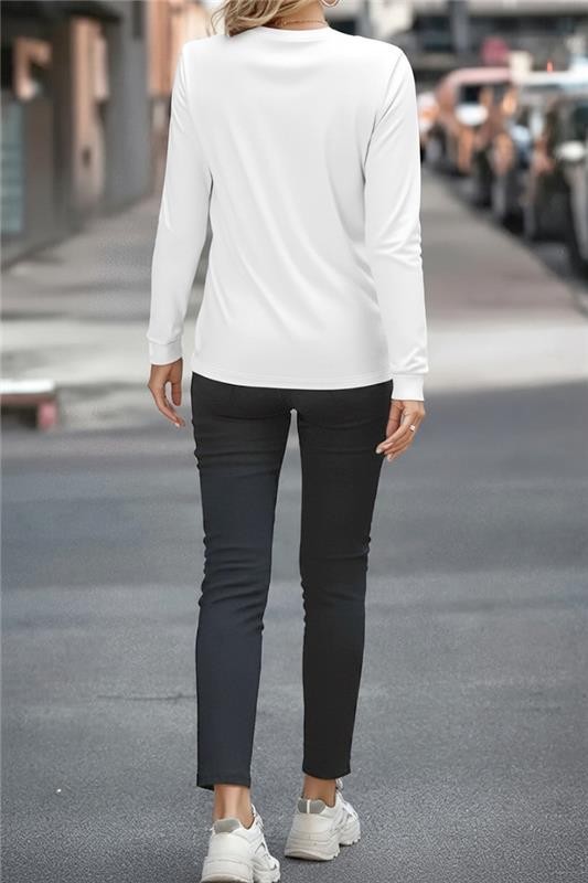 - Bluzka ma okrągły dekolt i luźny krój, a spodnie – wysoką, elastyczną talię, wiązania i kieszenie boczne.