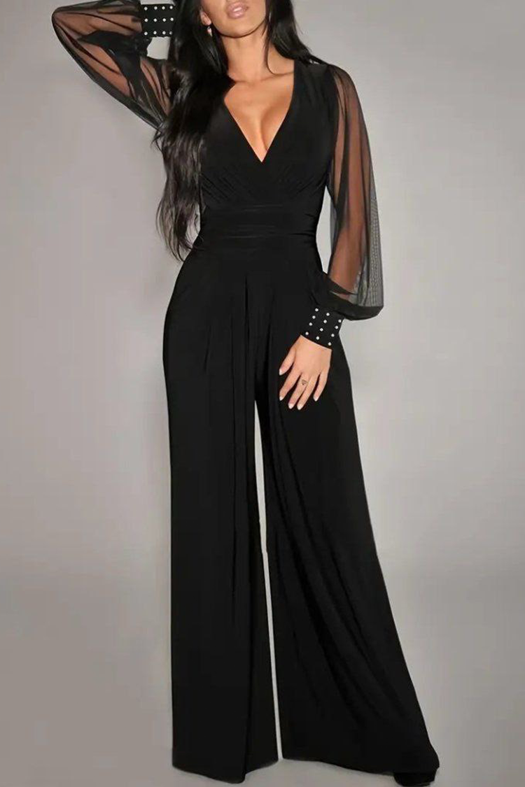 - Model ma luźny krój, głęboki dekolt w serek i szerokie transparentne rękawy.