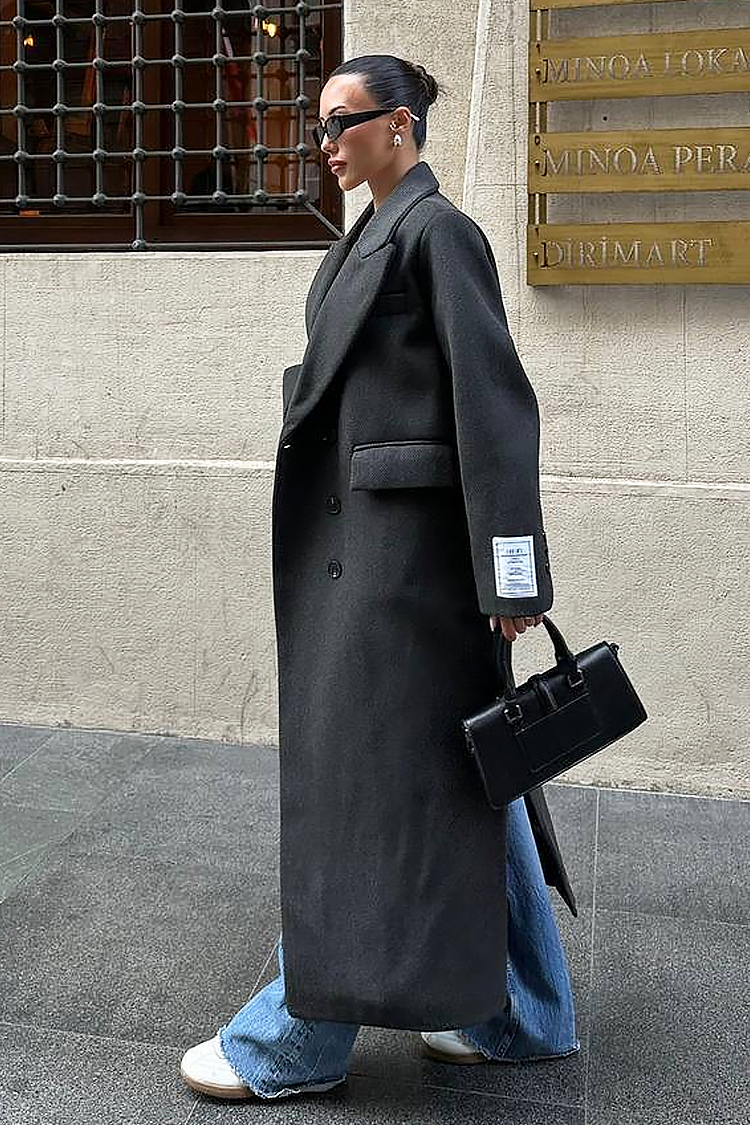 - Wybierz ten długi płaszcz o modnym kroju, który sprawdzi się w różnych stylizacjach.