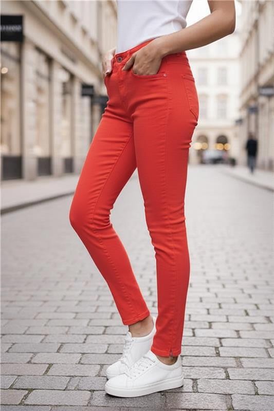 - Urozmaić swoją garderobę praktycznym modelem jeansów w kolorze koralowym z zamkiem błyskawicznym na końcu nogawek.