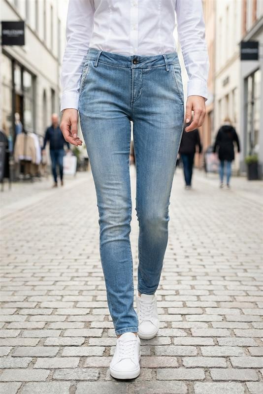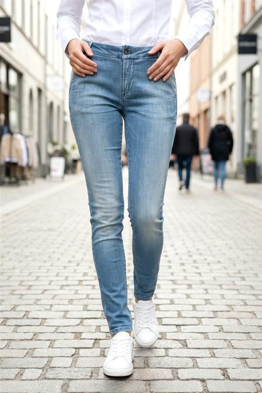 - Podstawowy model damskich jeansów w kolorze jasnoniebieskim z efektem wybielenia, idealny na co dzień lub na spacer.