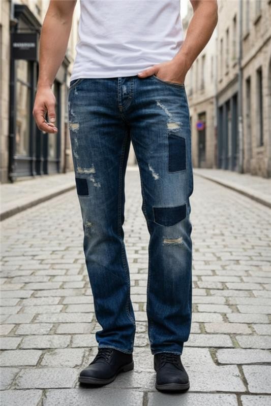 - Praktyczny model jeansów z ozdobnymi przetarciami i przetarciami na nogawkach, idealny na co dzień.