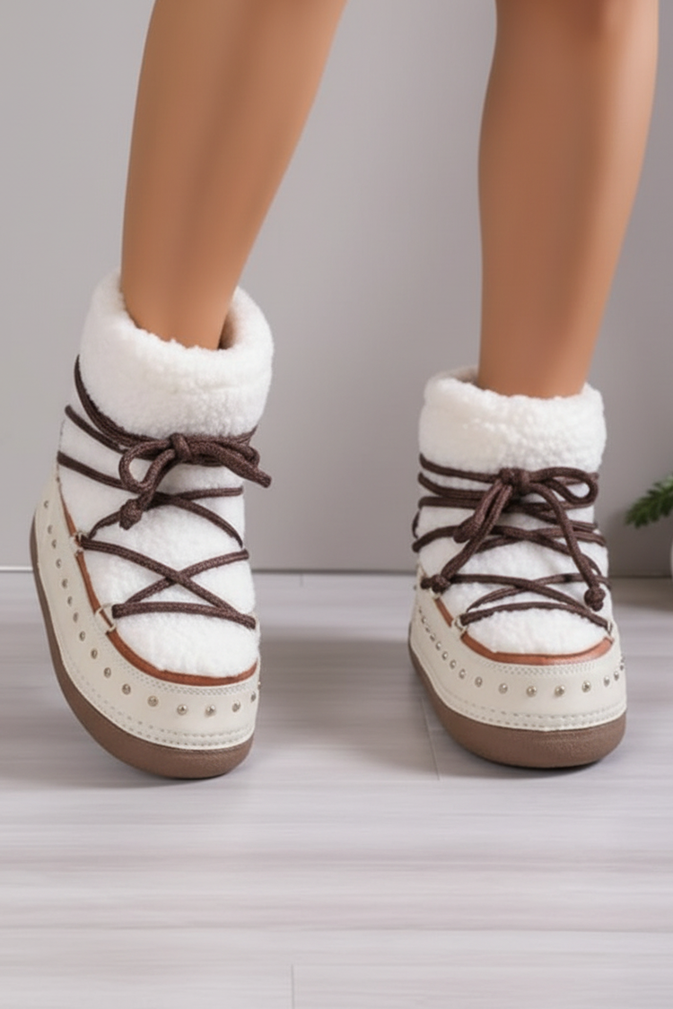 - Ciepłe damskie śniegowce wykonane z wodoodpornego materiału, ozdobione puszystym eko-futrem w kolorze białym.