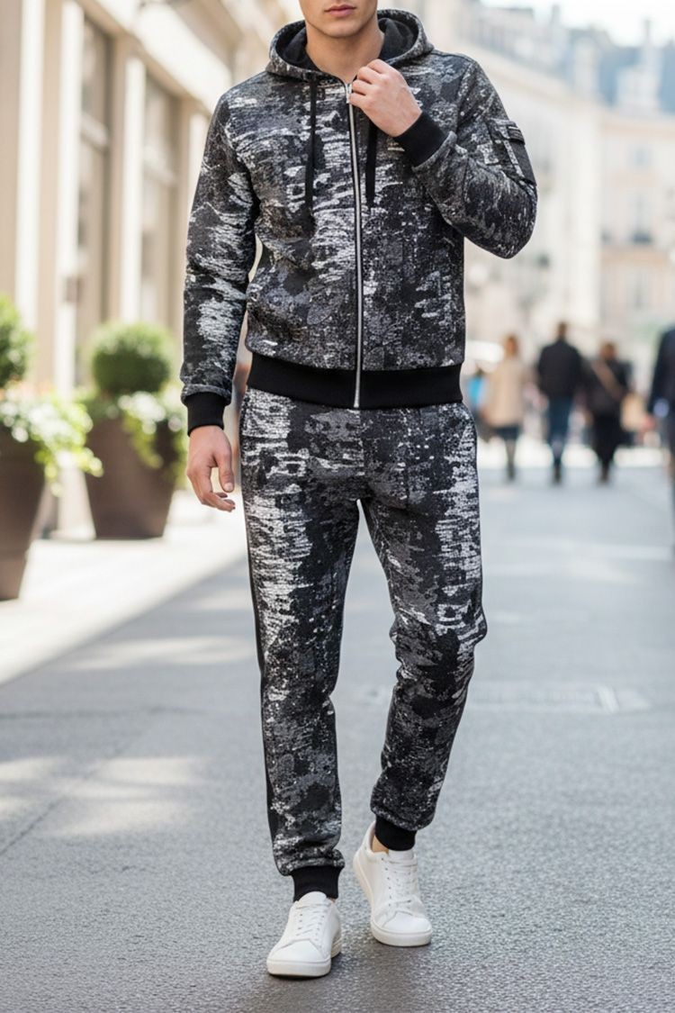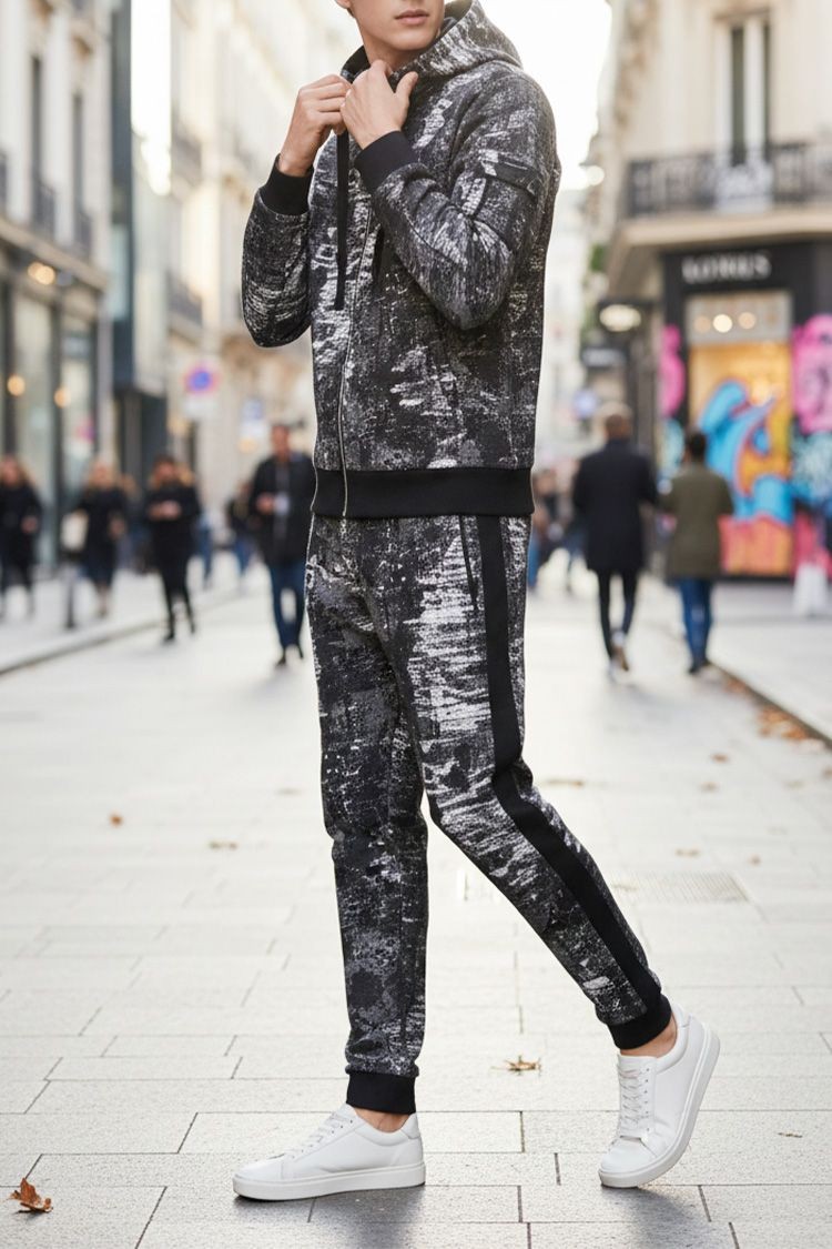 - Wygodny męski dwuczęściowy komplet o niestandardowym wzorze, składający się z bluzy i spodni.