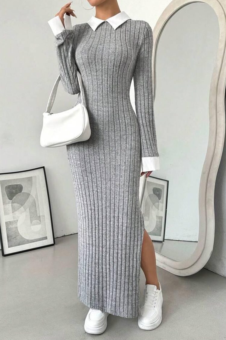 - Model ma dopasowany krój, długie rękawy, jednolity wzór, seksowne rozcięcie i efektowny biały kołnierzyk.
