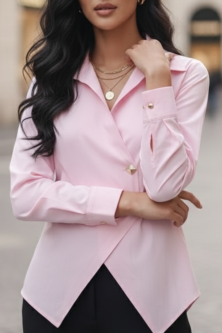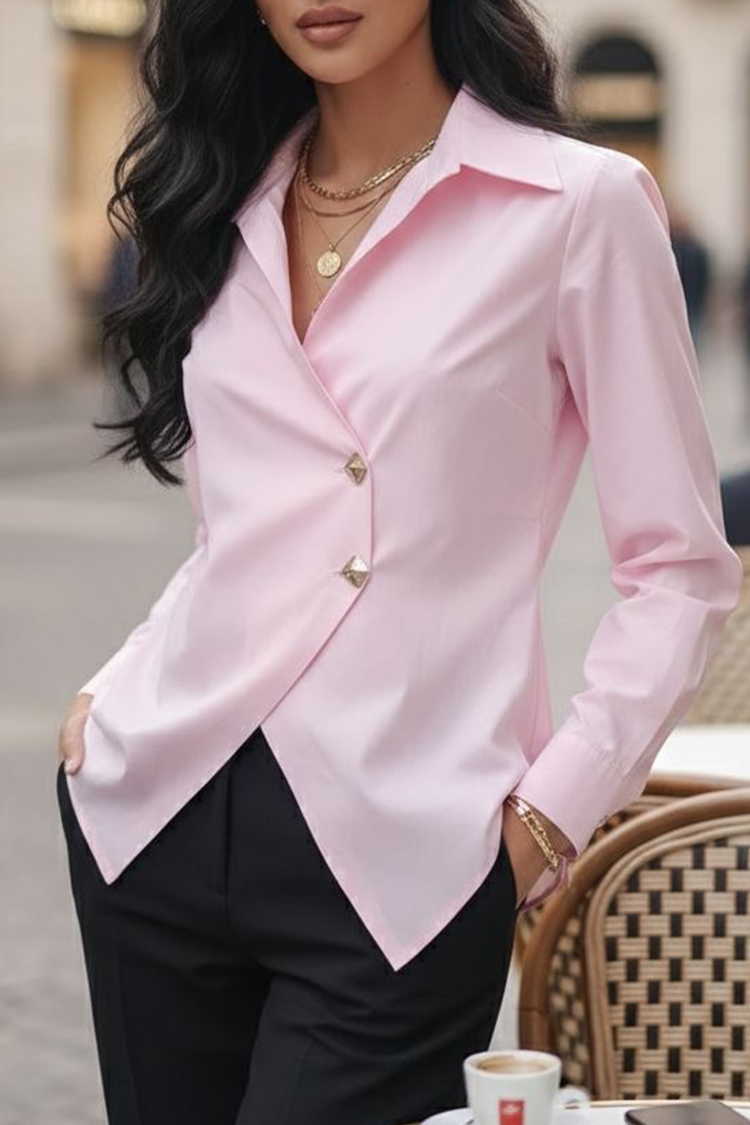 - Model ma asymetryczny krój, jednolity wzór, kołnierzyk i atrakcyjne guziki.