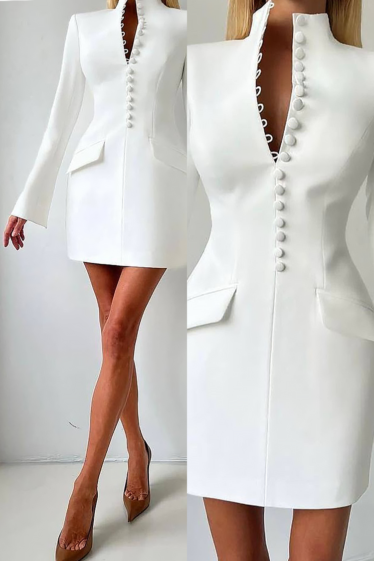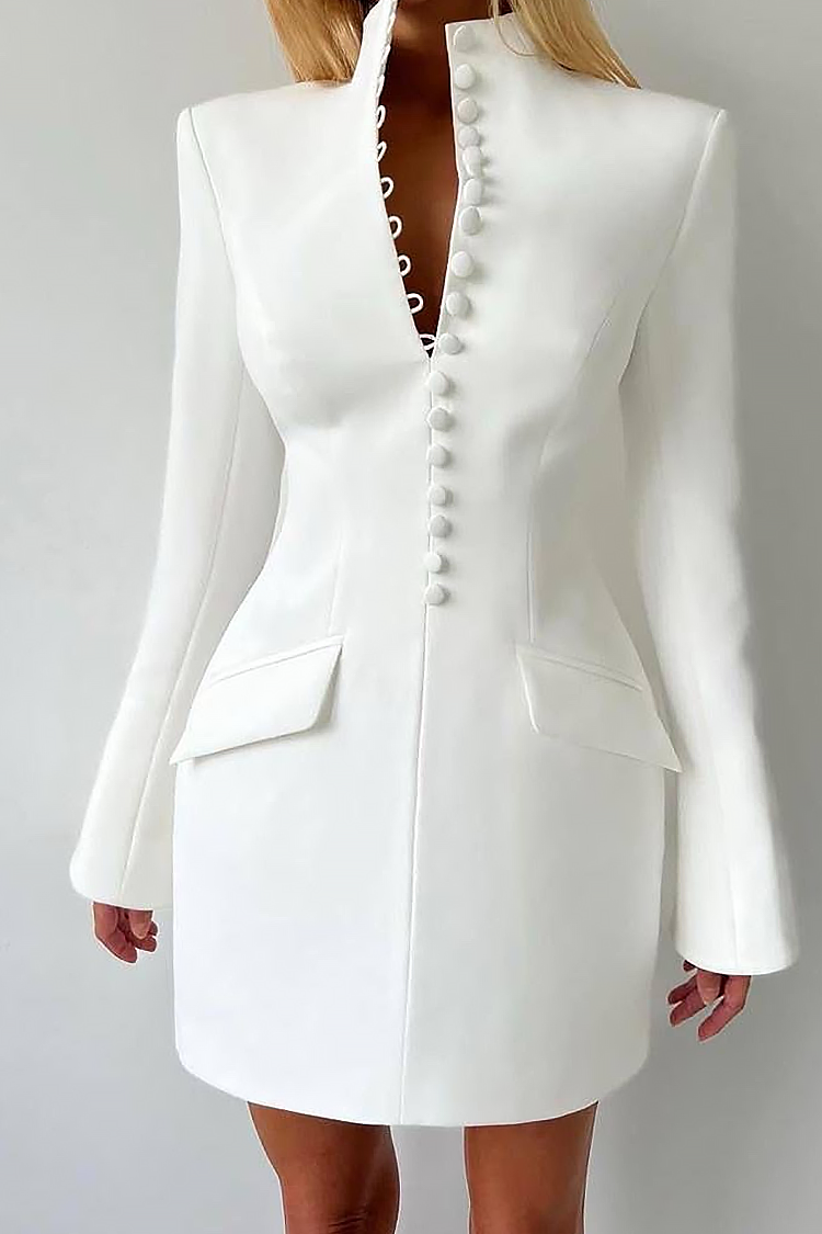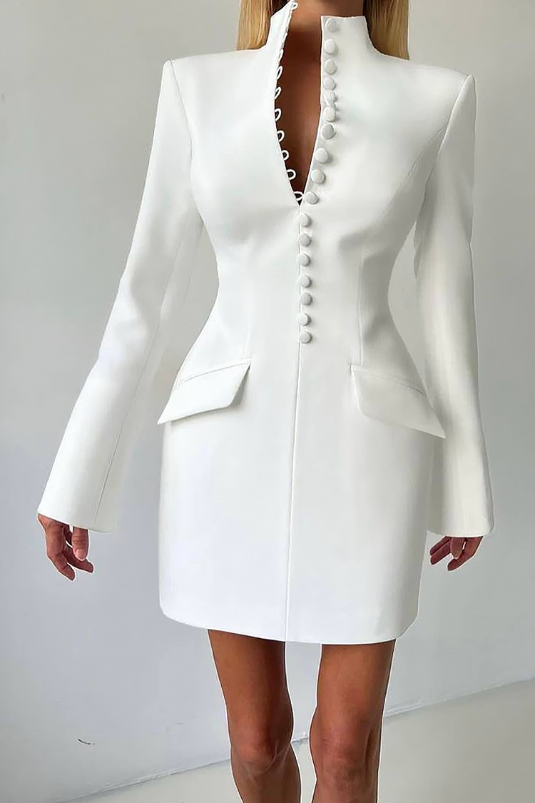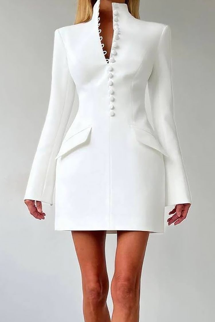- Sukienka ma elegancki krój marynarki, zapięcie na guziki, długie rękawy i stylowe kieszenie.