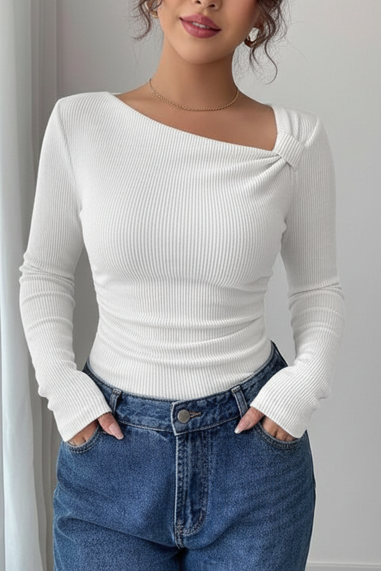 Dopasowany krój z asymetrycznym dekoltem podkreśla sylwetkę