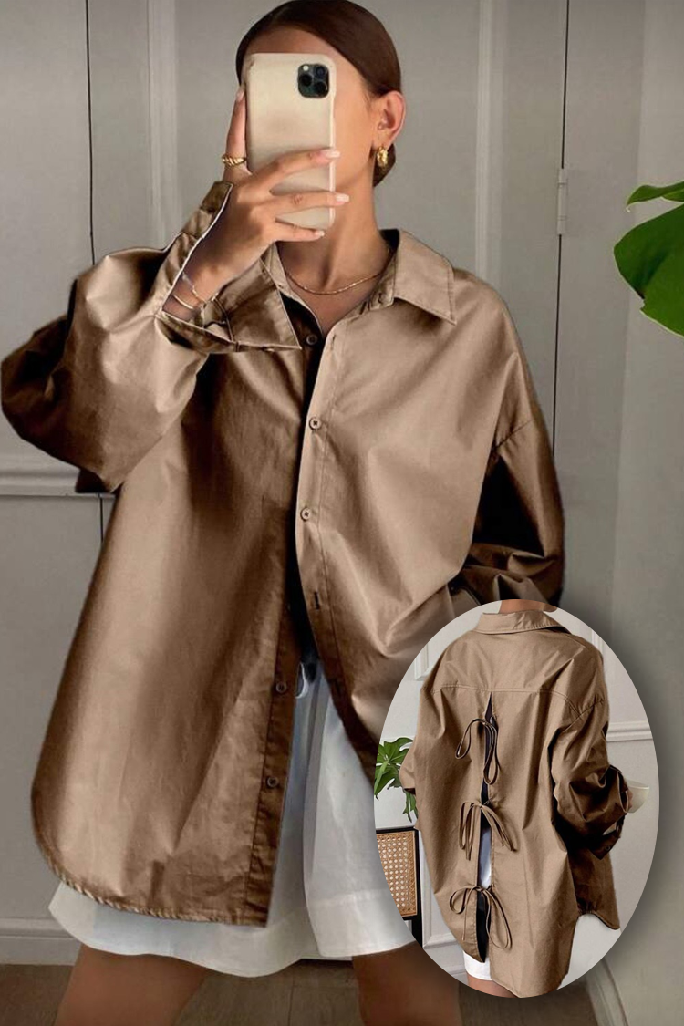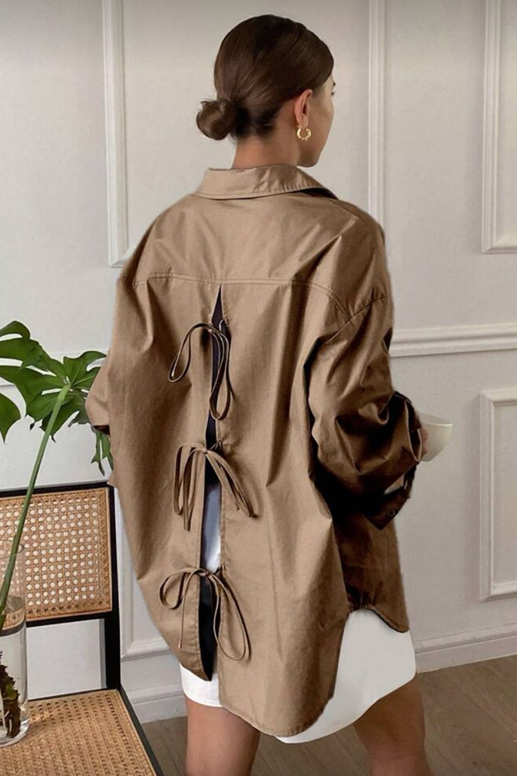 Zapięcie na guziki z przodu i efektowny tył z ozdobnymi wstążkami dodają charakteru