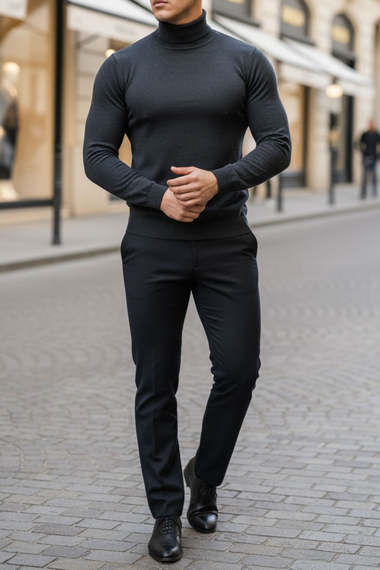 Elegancki męski golf w kolorze grafitowym o dopasowanym kroju to idealny wybór dla mężczyzn ceniących styl i wygodę. Wykonany z miękkiej, cienkiej dzianiny, zapewnia komfort noszenia oraz ciepło bez uczucia ciężkości.