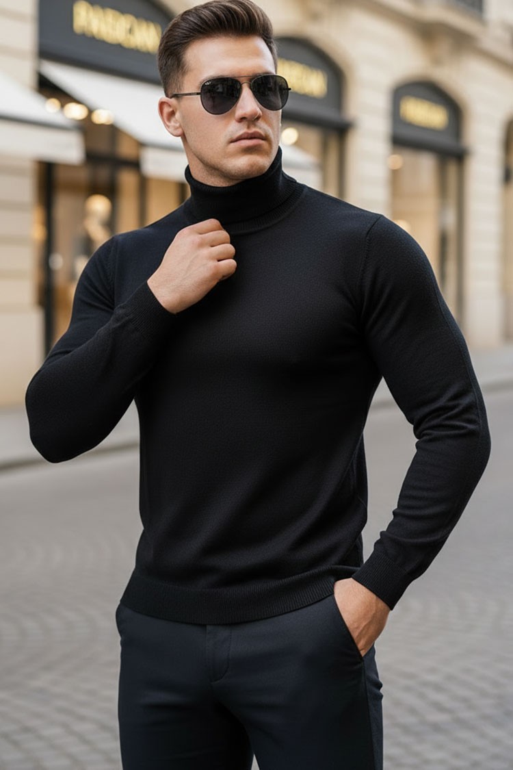 Elegancki męski golf w kolorze czarnym o dopasowanym kroju to idealny wybór dla mężczyzn ceniących styl i wygodę. Wykonany z miękkiej, cienkiej dzianiny, zapewnia komfort noszenia oraz ciepło bez uczucia ciężkości.