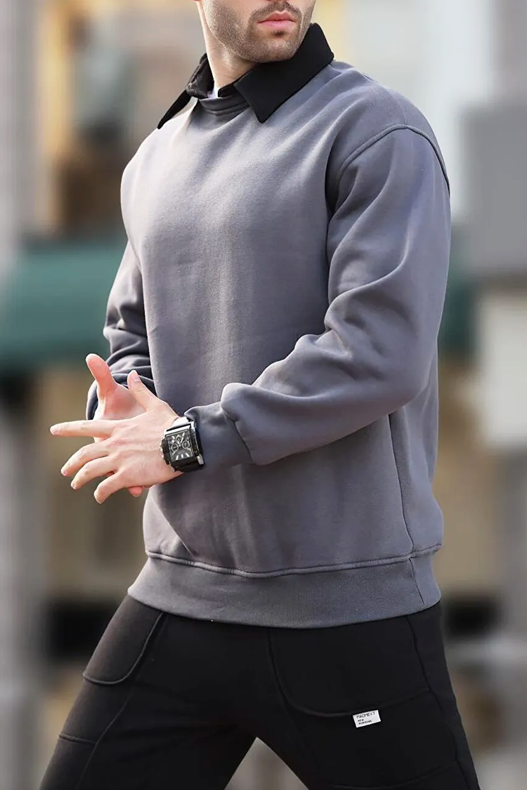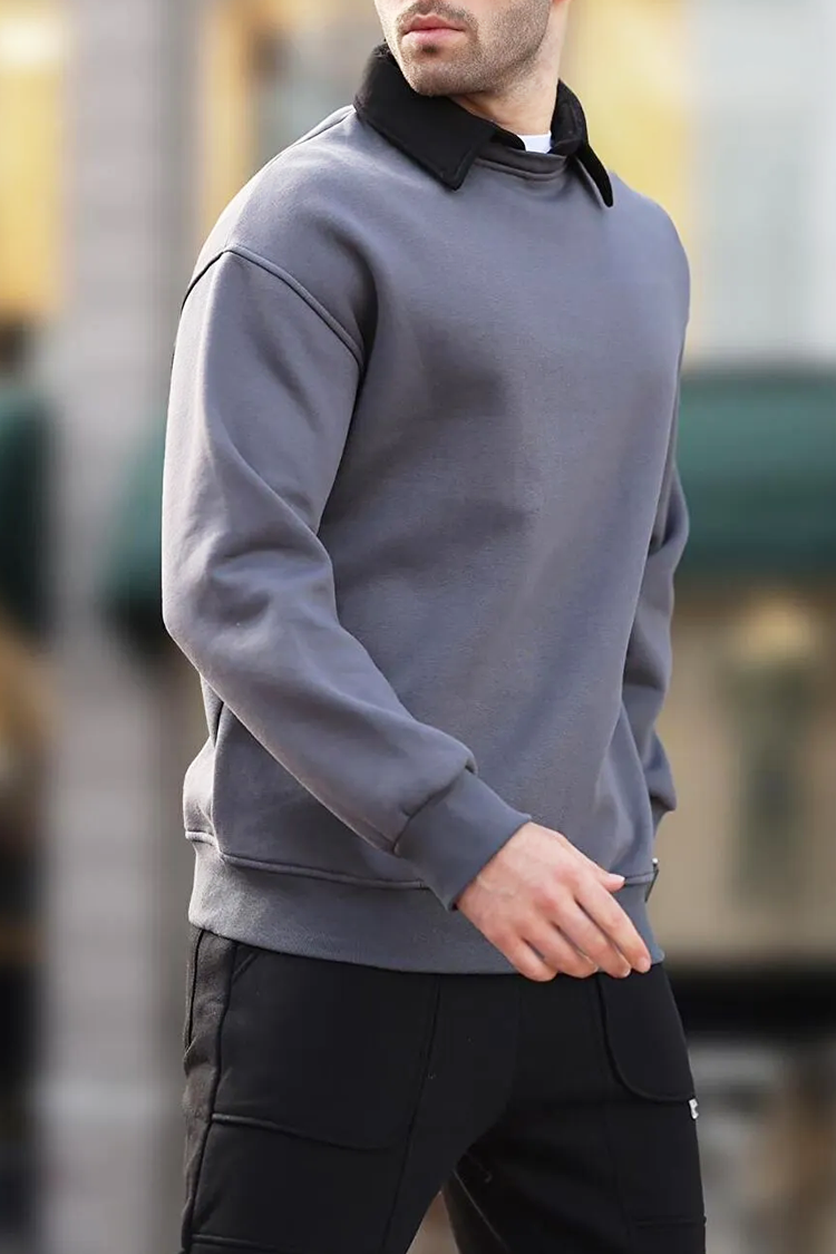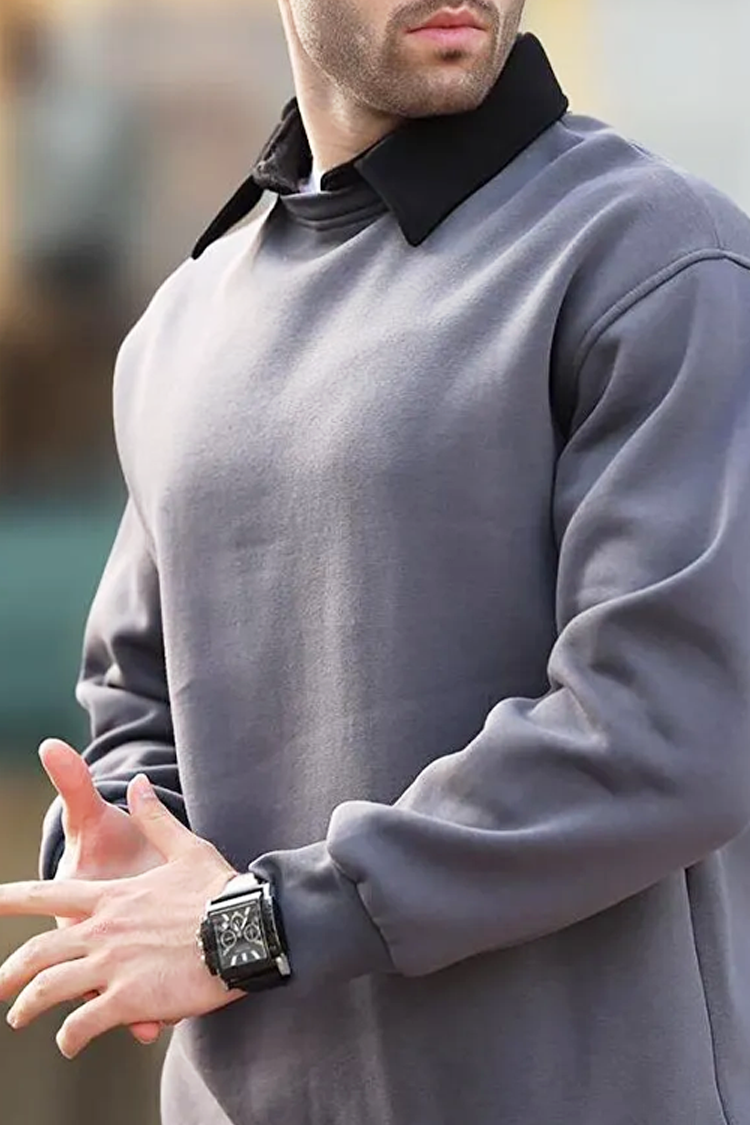 Stylowa i efektowna męska bluza z kontrastowym kołnierzem oraz uniwersalnym krojem, który pasuje do każdej sylwetki. Model ma luźny fason, zapewniający komfort noszenia przez cały dzień.