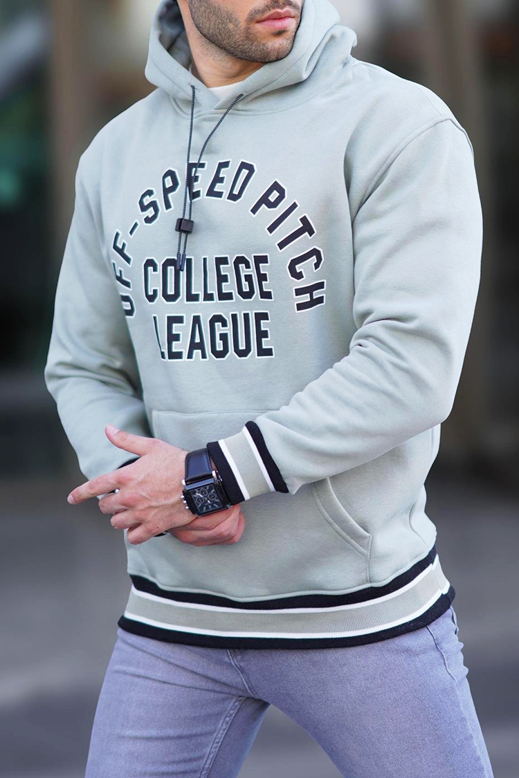 Praktyczna męska bluza w kolorze miętowym z kontrastowym napisem, dużą kieszenią i kapturem z wiązaniem. Model ma luźny krój, który pasuje do każdej sylwetki, zapewniając wygodę i komfort noszenia. Bluza sprawdzi się na co dzień lub jako element sportowego looku. Łatwo zestawić ją z jeansami lub spodniami, tworząc stylowy i funkcjonalny outfit.