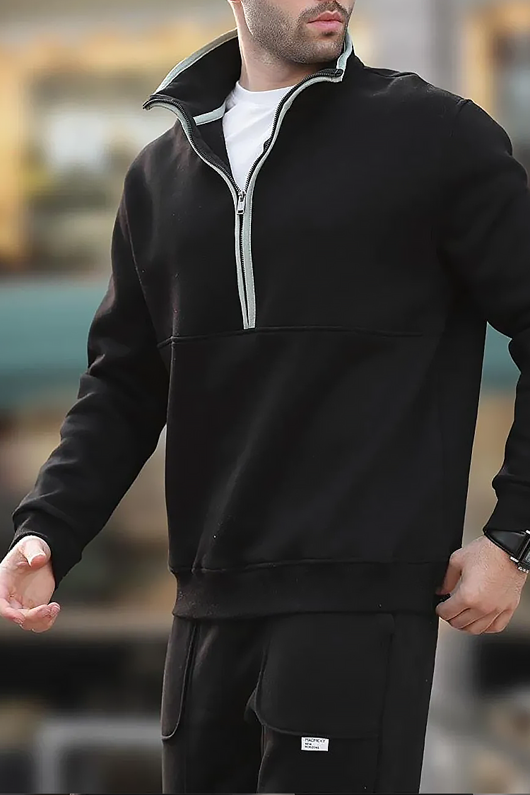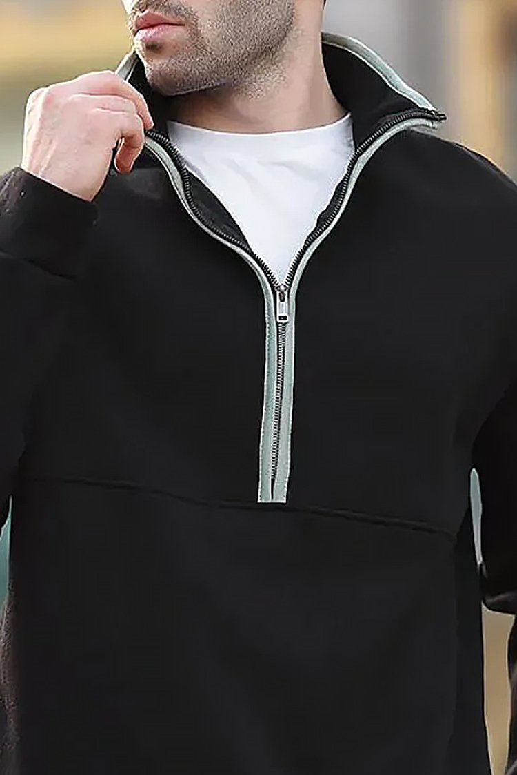 Praktyczna męska bluza w kolorze czarnym o minimalistycznym designie, wyposażona w wysoki kołnierz i zamek błyskawiczny. Model ma luźny krój, który pasuje do każdej sylwetki i zapewnia wysoki komfort noszenia na co dzień.