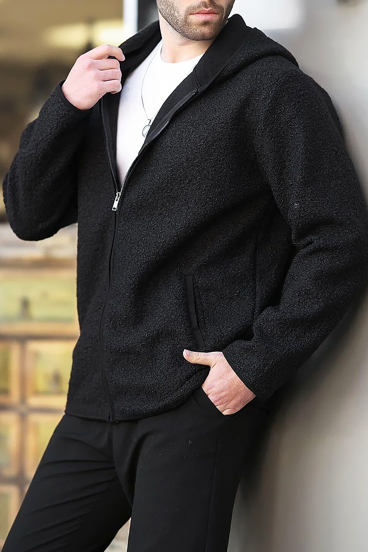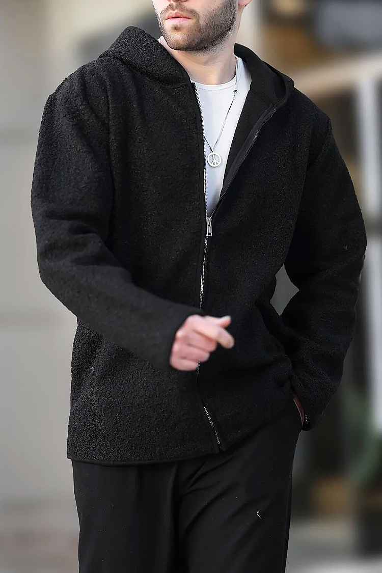 Uniwersalna męska bluza w klasycznym czarnym kolorze, wykonana z miękkiego i przyjemnego w dotyku polaru. Model posiada kaptur oraz zamek błyskawiczny, a luźny krój dopasowuje się do każdej sylwetki, zapewniając wysoki komfort noszenia.