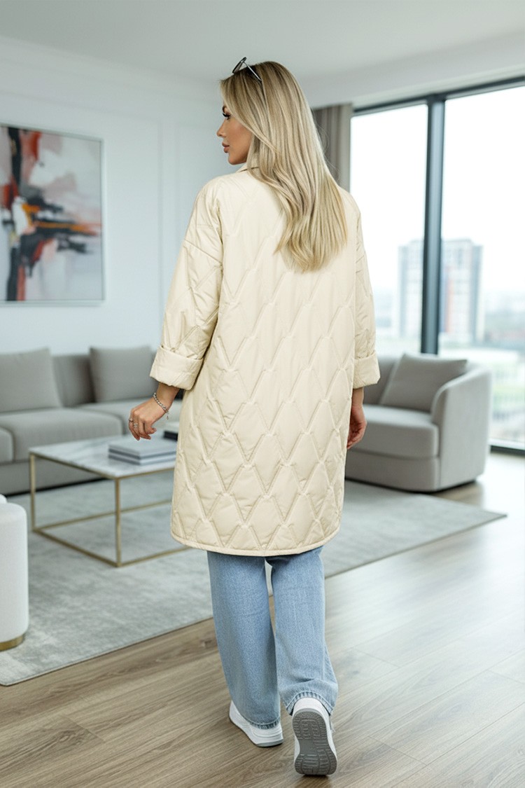 Pikowana tkanina jest miękka, zapewnia ciepło i komfort noszenia w chłodniejsze dni, a uniwersalny fason pozwala łatwo łączyć kurtkę z różnymi stylizacjami – zarówno casualowymi, jak i bardziej eleganckimi.