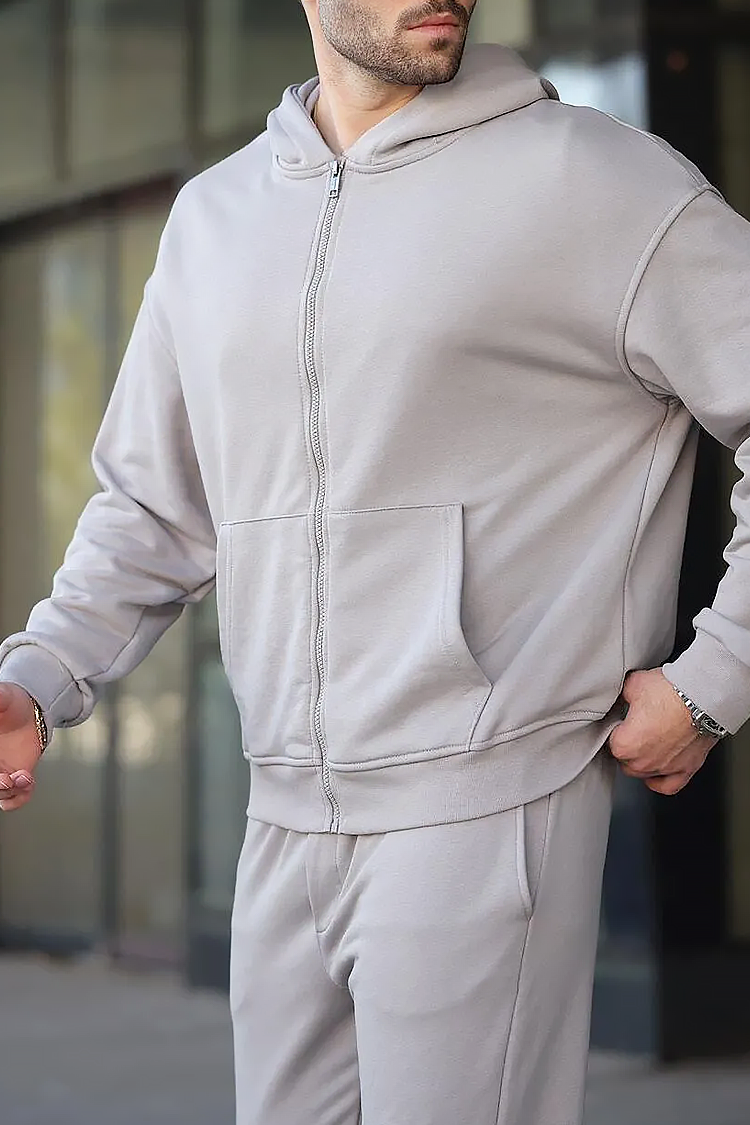 Wygodny, dwuczęściowy komplet sportowy składający się z bluzy z kapturem i spodni z kieszeniami w klasycznym szarym kolorze. Wykonany z miękkiej, bawełnianej tkaniny, która zapewnia komfort noszenia przez cały dzień.