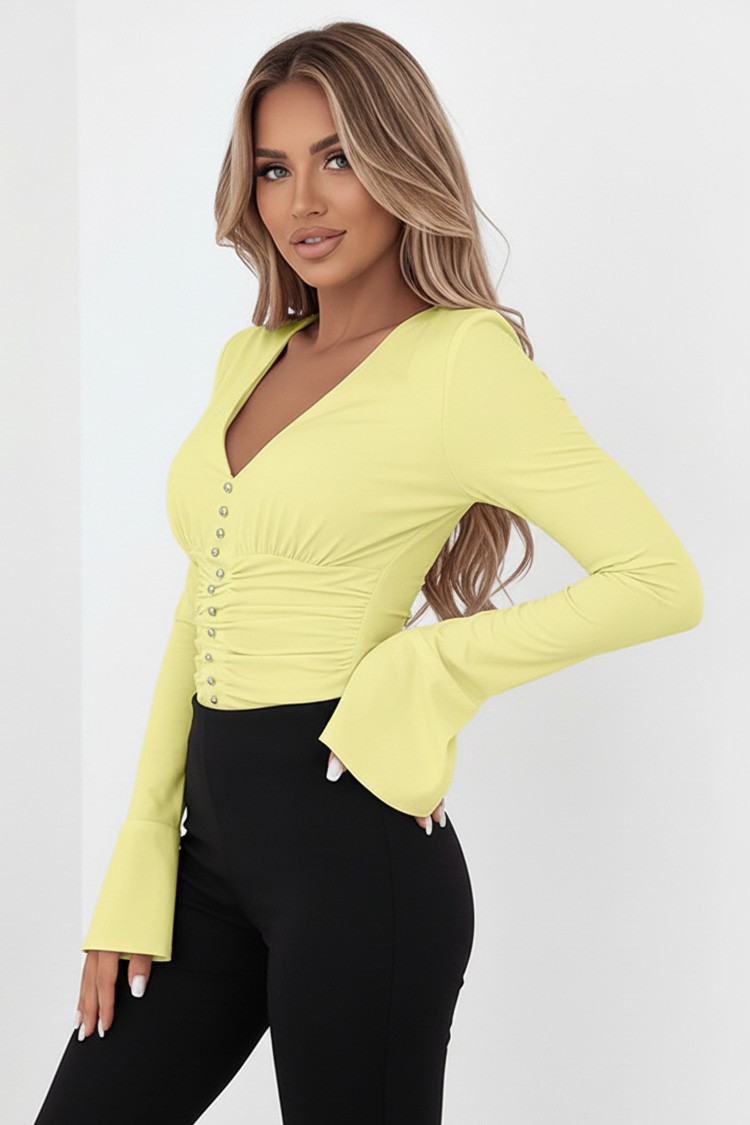 Połącz styl z wygodą dzięki tej atrakcyjnej bluzce, która sprawdzi się w każdej kobiecej garderobie. Wykonana z wysokiej jakości materiału, gwarantuje przyjemne uczucie podczas noszenia przez cały dzień. Model wyróżnia się dekoltem w serek, subtelnym plisowaniem i rozszerzanymi rękawami, które dodają lekkości i elegancji.