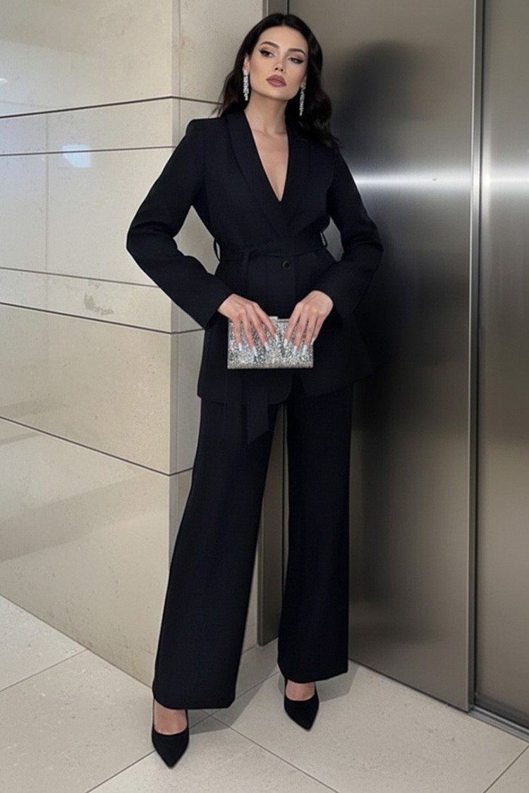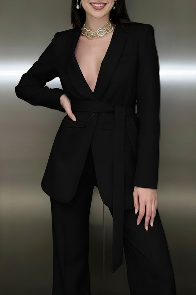 Uzyskaj elegancki i nieskazitelny look dzięki temu dwuczęściowemu kompletowi w klasycznym kolorze. Materiał jest miękki, zapewnia komfort noszenia i swobodę ruchów przez cały dzień. Marynarka zapinana na guziki ma dół wykończony tekstylnym paskiem w tym samym kolorze, co podkreśla sylwetkę i dodaje stylowego charakteru. Spodnie mają wysoki stan, elegancki krój i szerokie nogawki, co optycznie wydłuża nogi i sprawia, że komplet jest uniwersalny w stylizacji. Idealny zestaw do połączenia z butami na wysokim obcasie i małą torebką.