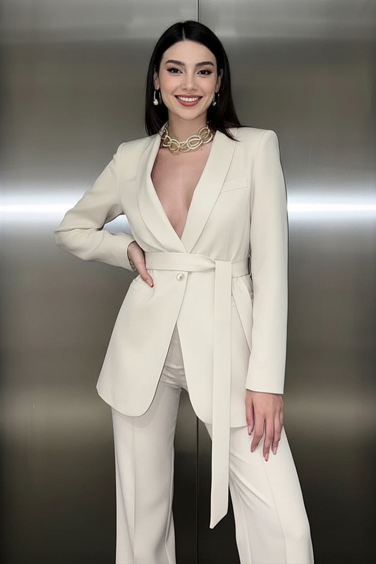 Uzyskaj elegancki i nieskazitelny look dzięki temu dwuczęściowemu kompletowi w klasycznym kolorze. Materiał jest miękki, zapewnia komfort noszenia i swobodę ruchów przez cały dzień. Marynarka zapinana na guziki ma dół wykończony tekstylnym paskiem w tym samym kolorze, co podkreśla sylwetkę i dodaje stylowego charakteru. Spodnie mają wysoki stan, elegancki krój i szerokie nogawki, co optycznie wydłuża nogi i sprawia, że komplet jest uniwersalny w stylizacji. Idealny zestaw do połączenia z butami na wysokim obcasie i małą torebką.