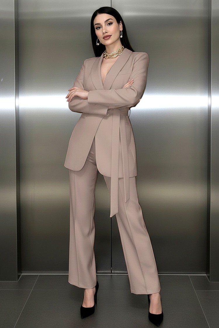 Uzyskaj elegancki i nieskazitelny look dzięki temu dwuczęściowemu kompletowi w klasycznym kolorze. Materiał jest miękki, zapewnia komfort noszenia i swobodę ruchów przez cały dzień. Marynarka zapinana na guziki ma dół wykończony tekstylnym paskiem w tym samym kolorze, co podkreśla sylwetkę i dodaje stylowego charakteru. Spodnie mają wysoki stan, elegancki krój i szerokie nogawki, co optycznie wydłuża nogi i sprawia, że komplet jest uniwersalny w stylizacji. Idealny zestaw do połączenia z butami na wysokim obcasie i małą torebką.