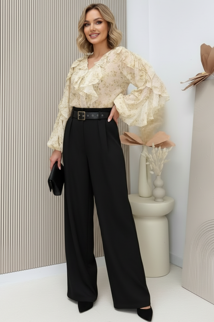 Te praktyczne spodnie w klasycznym kolorze zapewniają idealny wygląd i komfort przez cały dzień. Wykonane z miękkiej, przyjemnej w dotyku tkaniny, która nie podrażnia skóry. Model ma wysoki stan, wygodny krój i szerokie nogawki, a efektowny pasek z ekoskóry podkreśla talię i dodaje stylowego charakteru. Spodnie pasują zarówno do casualowych, jak i eleganckich stylizacji, stanowiąc uniwersalny element garderoby.