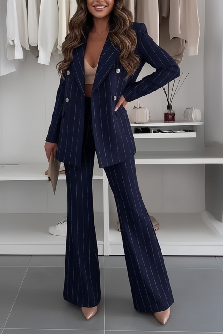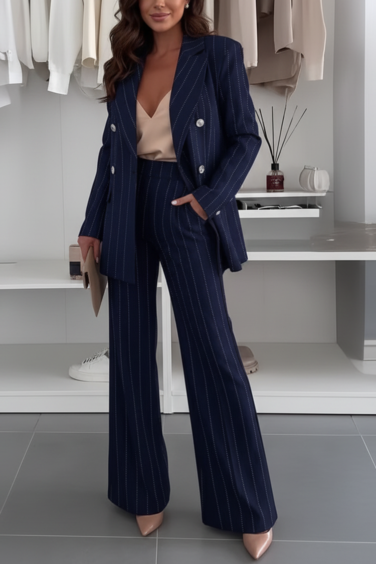 Stylowy dwuczęściowy komplet w klasycznym kolorze, idealny na eleganckie okazje i do pracy. Wykonany z miękkiego materiału zapewniającego komfort noszenia przez cały dzień. Marynarka posiada dwurzędowe zapięcie, bufiaste rękawy i stylowe klapy, a spodnie mają wysoki stan, elegancki krój i szerokie nogawki, które podkreślają sylwetkę. Całość można zestawić z butami na wysokim obcasie i małą torebką, tworząc kompletny, elegancki look.