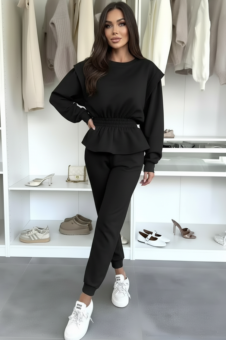 Wygodny dwuczęściowy komplet damski, idealny na co dzień. Wykonany z miękkiego materiału, który zapewnia komfort termiczny i przyjemne uczucie podczas noszenia. Bluzka ma luźny krój, długie rękawy oraz gumkę w pasie, dzięki czemu dobrze dopasowuje się do sylwetki. Spodnie z wysokim, elastycznym pasem gwarantują swobodę ruchów i wygodę przez cały dzień. Komplet doskonale sprawdzi się zarówno w casualowych, jak i sportowych stylizacjach.