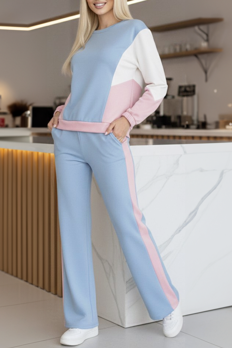 - Bluzka ma okrągły dekolt i wygodny krój, a spodnie – wysoki stan i długie nogawki.