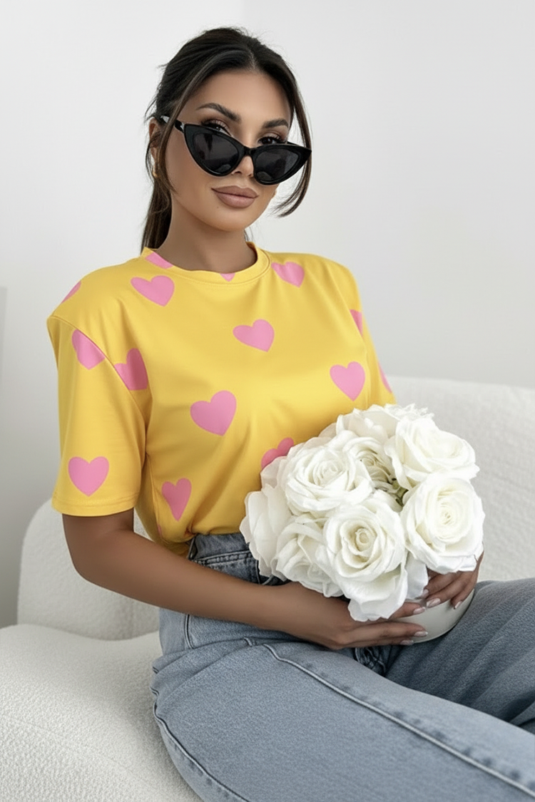 - Model ma krótkie rękawy, okrągły dekolt, precyzyjny krój i wzór w serca.