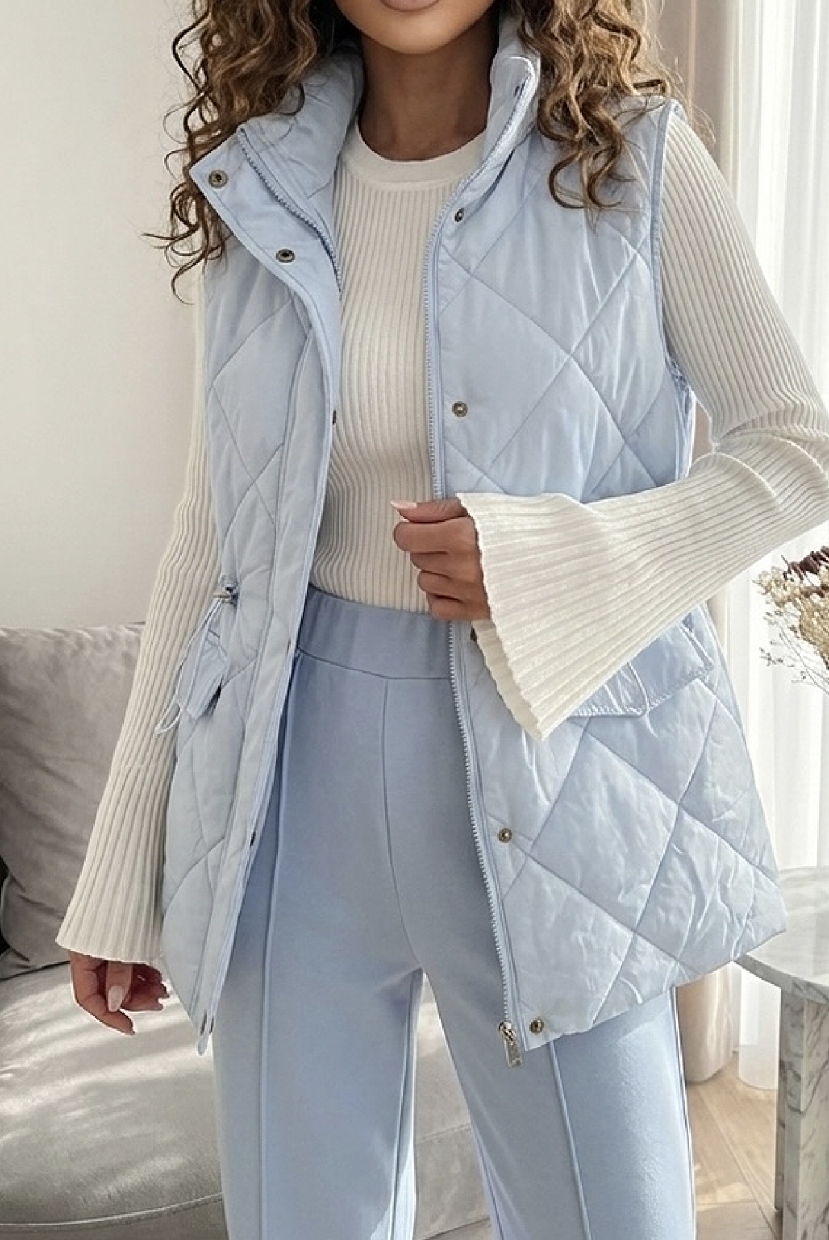 - Kamizelka ma klasyczny krój, kołnierz, kieszenie i pikowany wzór.