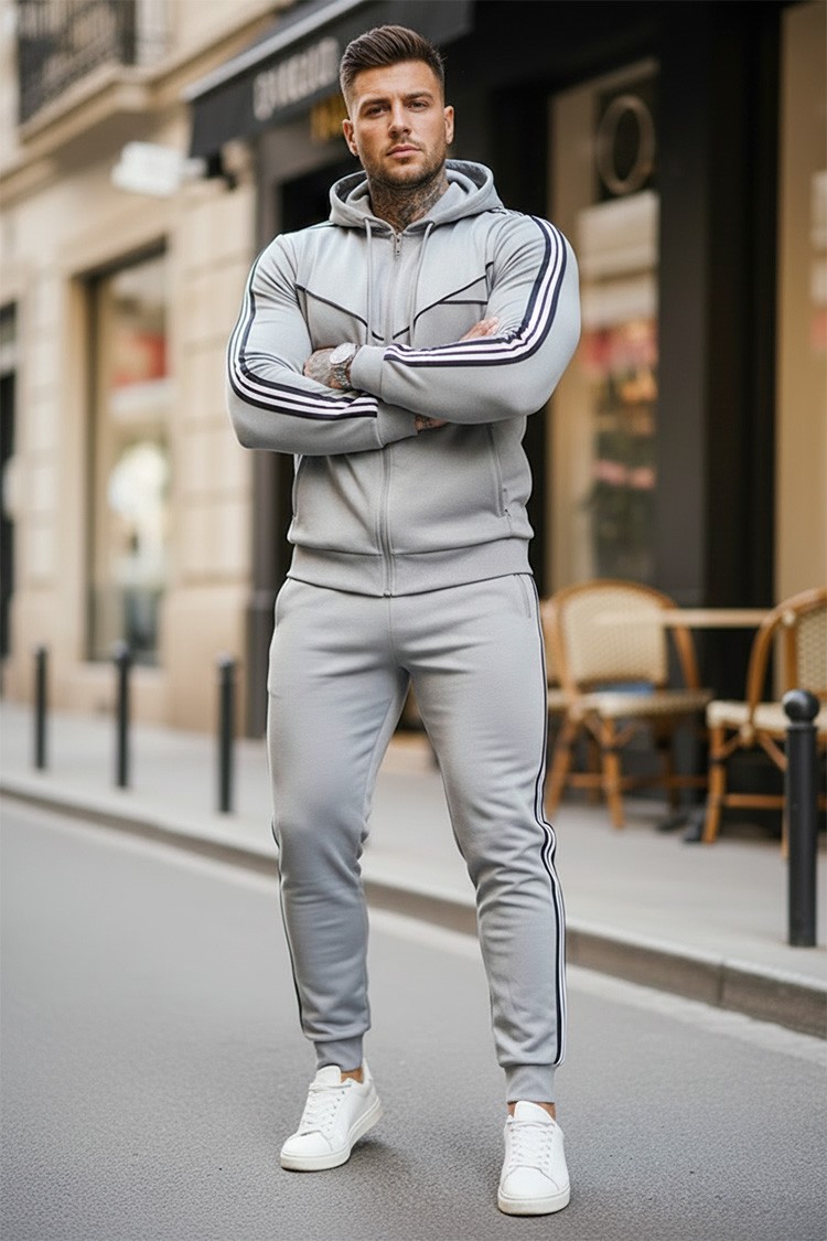 - Wygodny dwuczęściowy komplet męski w kolorze szarym z kontrastującymi, ozdobnymi liniami, składający się z bluzy i spodni.