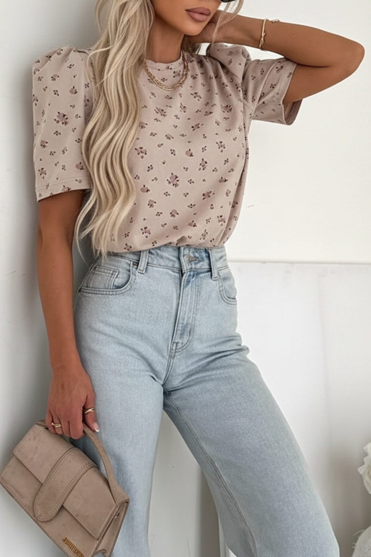 - Model ma krótkie i eleganckie rękawy, okrągły dekolt, precyzyjny krój i kwiatowy wzór.