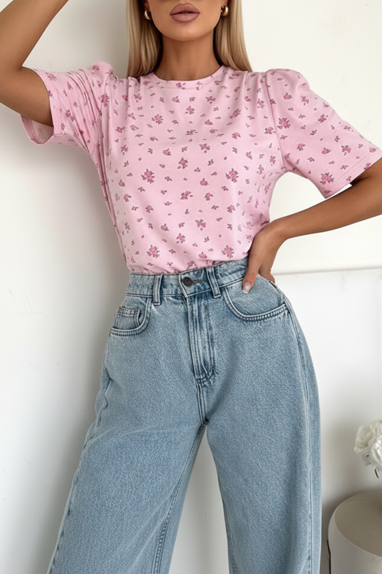 - Model ma krótkie i eleganckie rękawy, okrągły dekolt, precyzyjny krój i kwiatowy wzór.