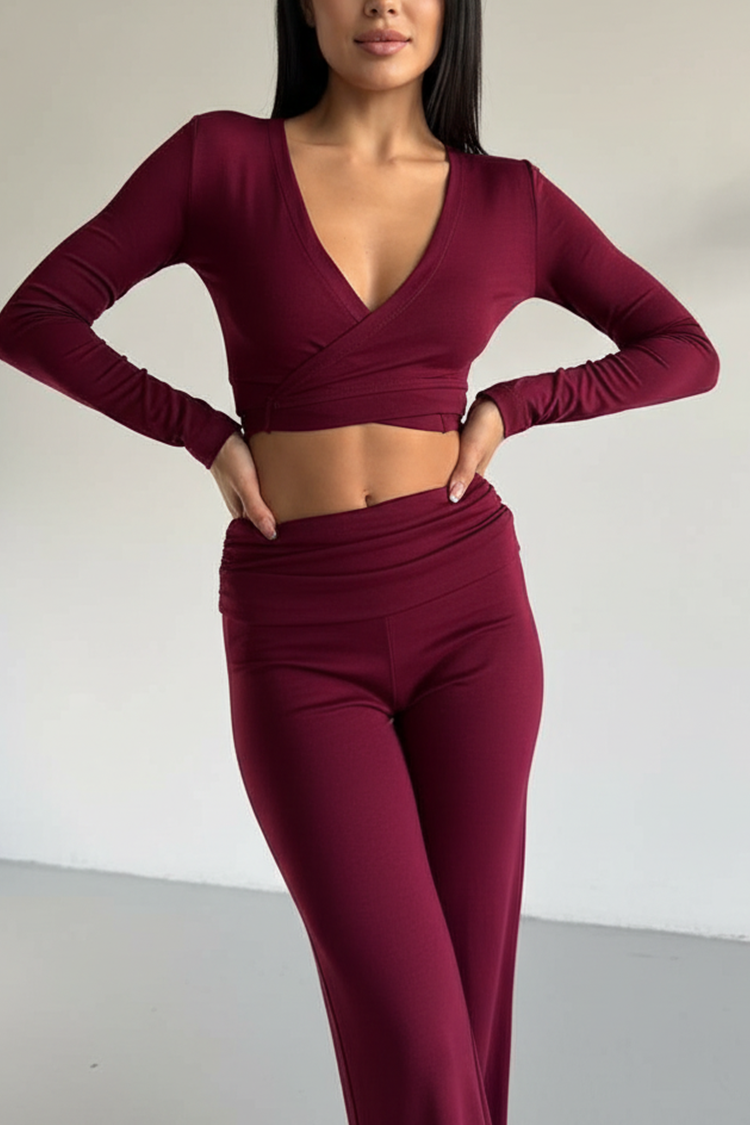 - Bluzka ma krótki krój i dekolt w serek.