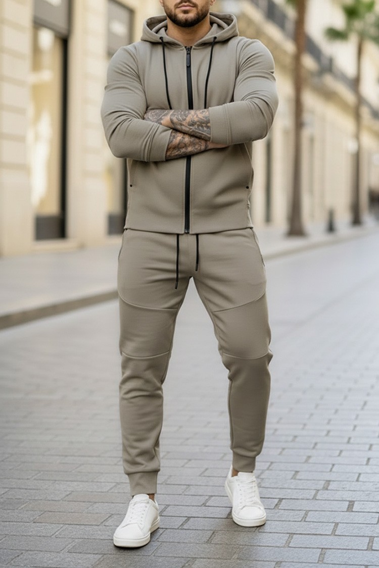 - Praktyczny dwuczęściowy komplet męski składający się z bluzy z kapturem i spodni w kolorze beżowym.