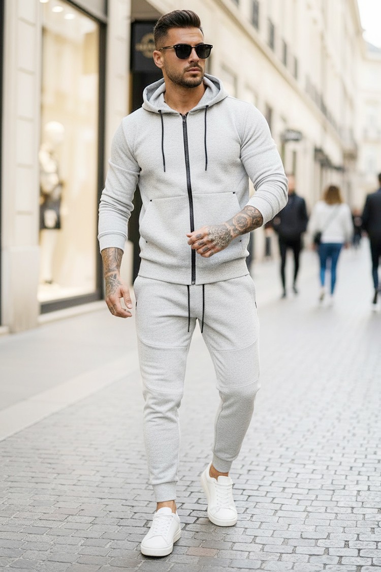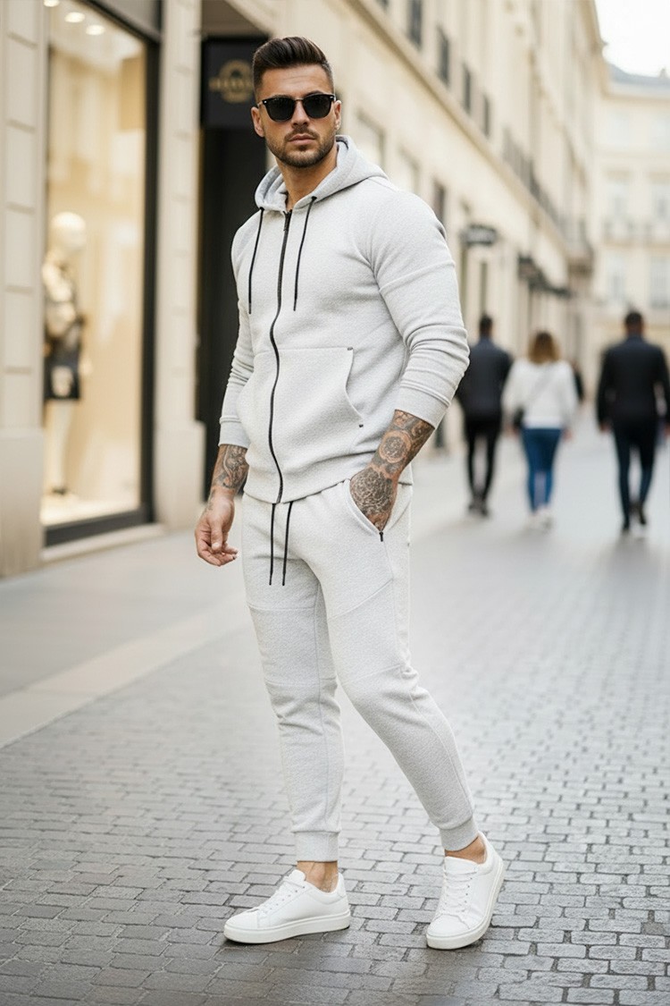- Praktyczny dwuczęściowy komplet męski składający się z bluzy z kapturem i spodni w kolorze szarym.